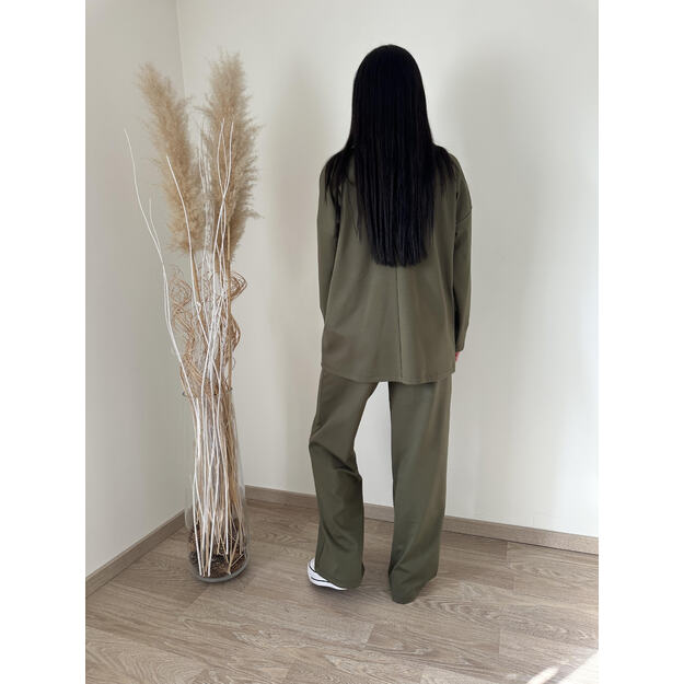 Šis stilingas dviejų dalių kostiumas - puikus pasirinkimas tiek kasdieniam įvaizdžiui, tiek ypatingoms progoms. Oversize tipo švarkas su kišenėmis suteikia modernumo, o platėjančios kelnės užtikrina laisvę judėti.